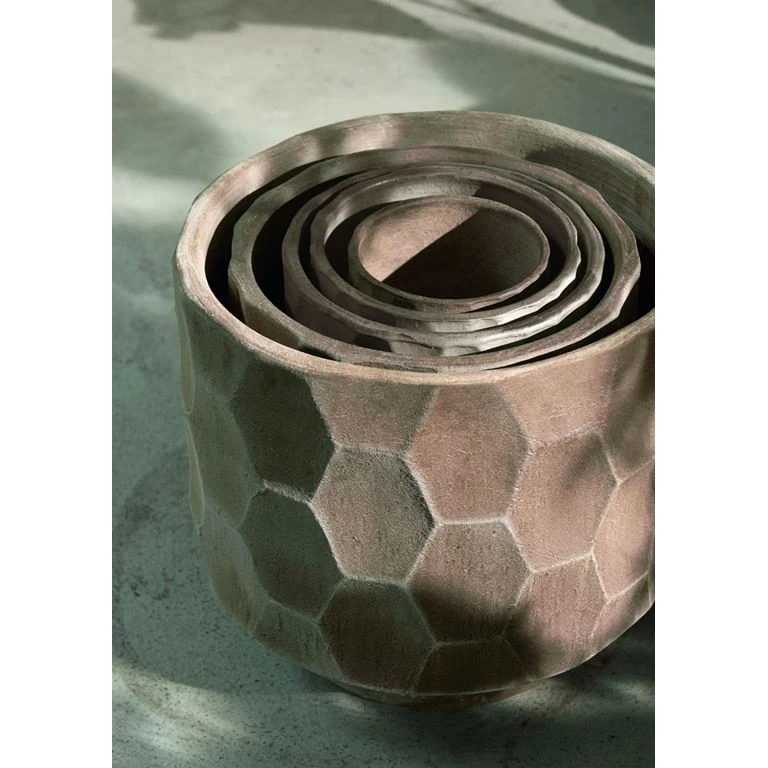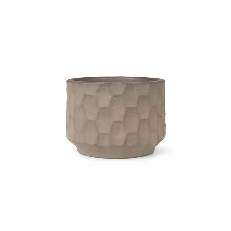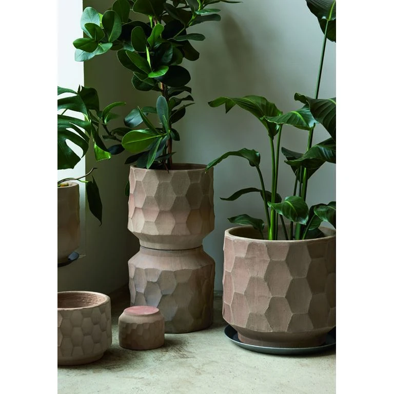 Med Gro-serien introducerer Kähler interiør til udendørsarealerne. Den lille, rustikke urtepotteskjuler har en helt unik overflade med markante sekskantede strukturer, der har hentet inspirationen i planternes verden. Takket være en helt særlig brændingsproces, hvor der bruges træ, er ikke to urtepotteskjulere ens, hvilket gør Gro til en helt specielt visuel oplevelse. Fyld den fine urtepotteskjuler med krydderurter og sæt den på terrassen eller altanen – eller inden døre i køkkenet. Urtepotteskjuleren er designet af den anerkendte, danske keramiker Christian Bruun. Måler Ø21,5v cm. Fås også i Ø26,5 cm og 16,5 cm. Vær opmærksom på at Gro plante krukker og urtepotter er brændt i en Lo Bar ovn. Glasuren på krukkerne er reaktiv, og derfor kan der være farve variationer, både fra krukke til krukke, men også på selve krukkerne. Man kan opleve at der vil være forskel i farve fra side til side eller fra top til bund. Dette er afhængigt af hvor i ovnen de står.