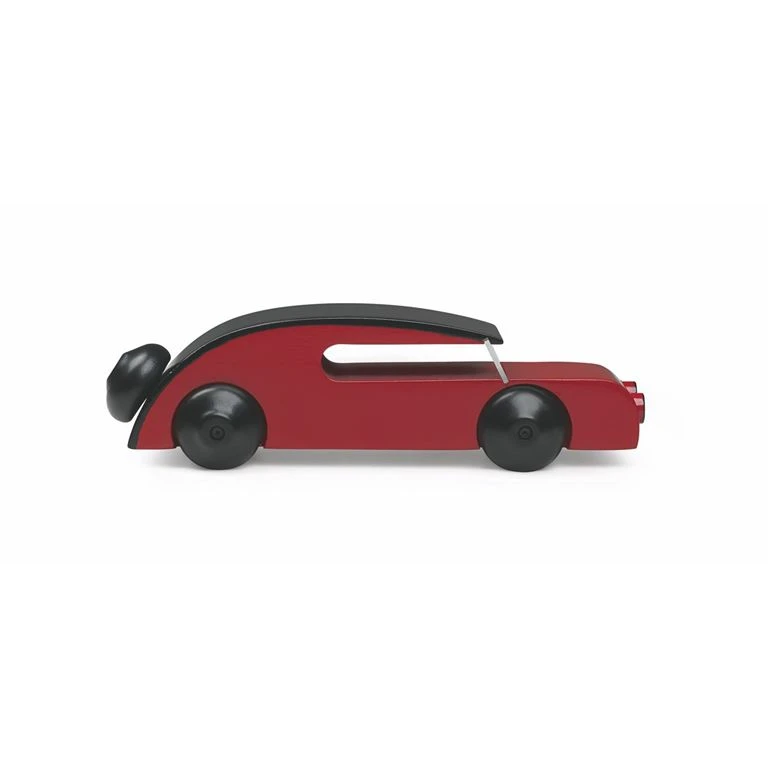 Den originale Sedan af Kay Bojesen med flotte aerodynamiske linjer, som blev tegnet og lavet første gang i 1937. Bilen er af bøgetræ og malet i farverne rød og sort.