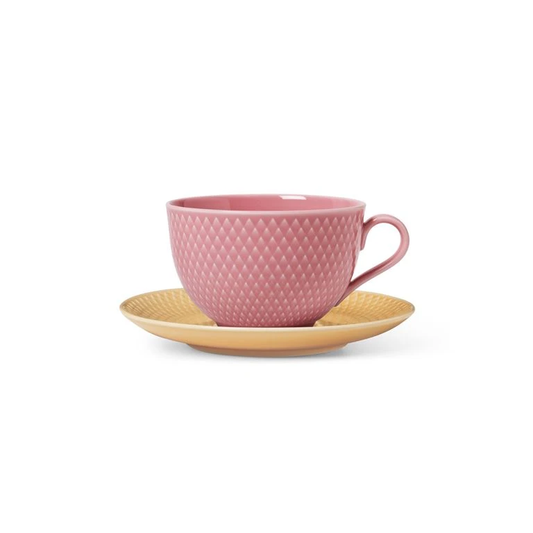 Lyngby Porcelæn Rhombe Tekop Med Underkop, Rosa/Gul, 39 Cl